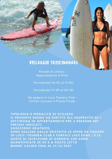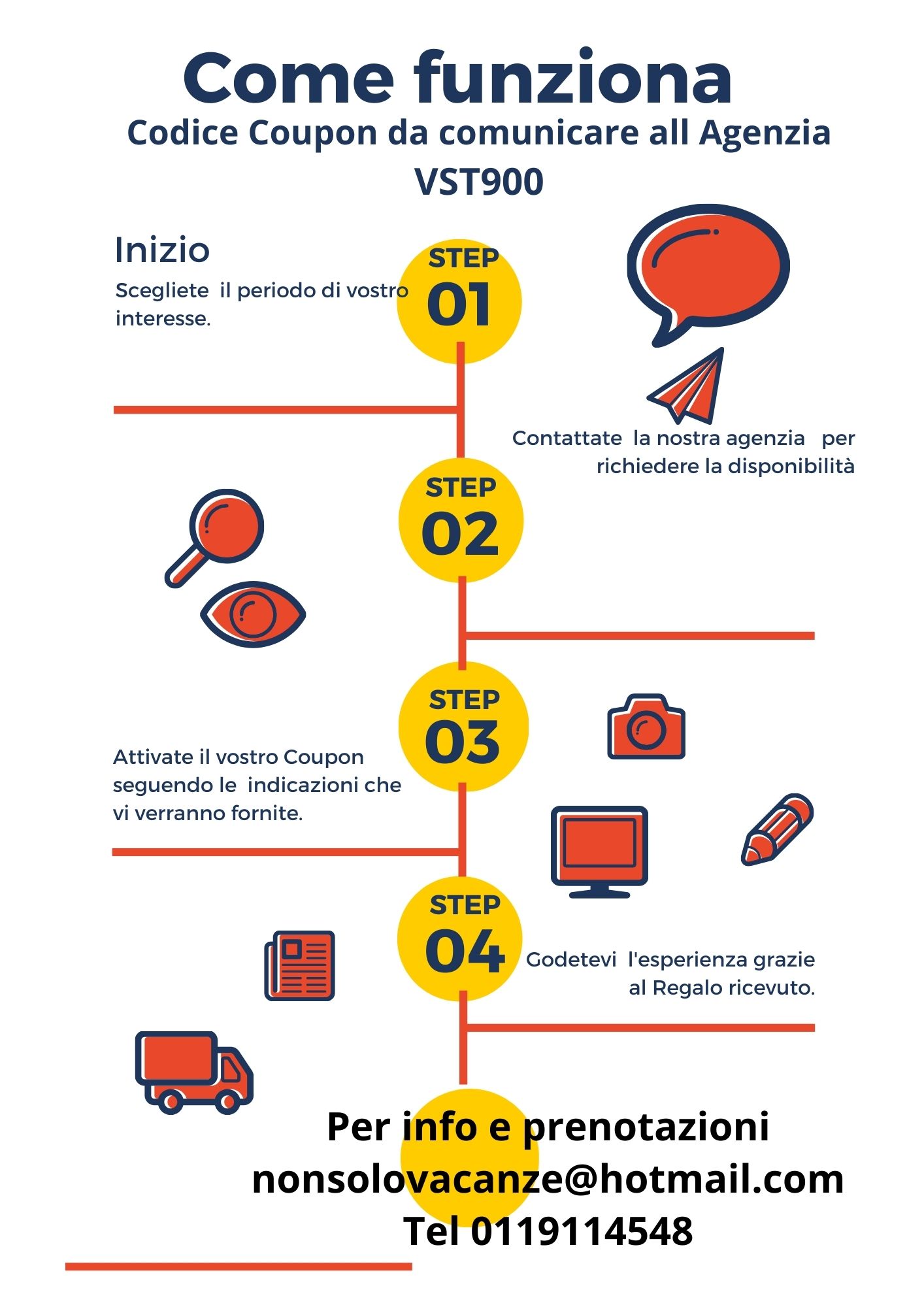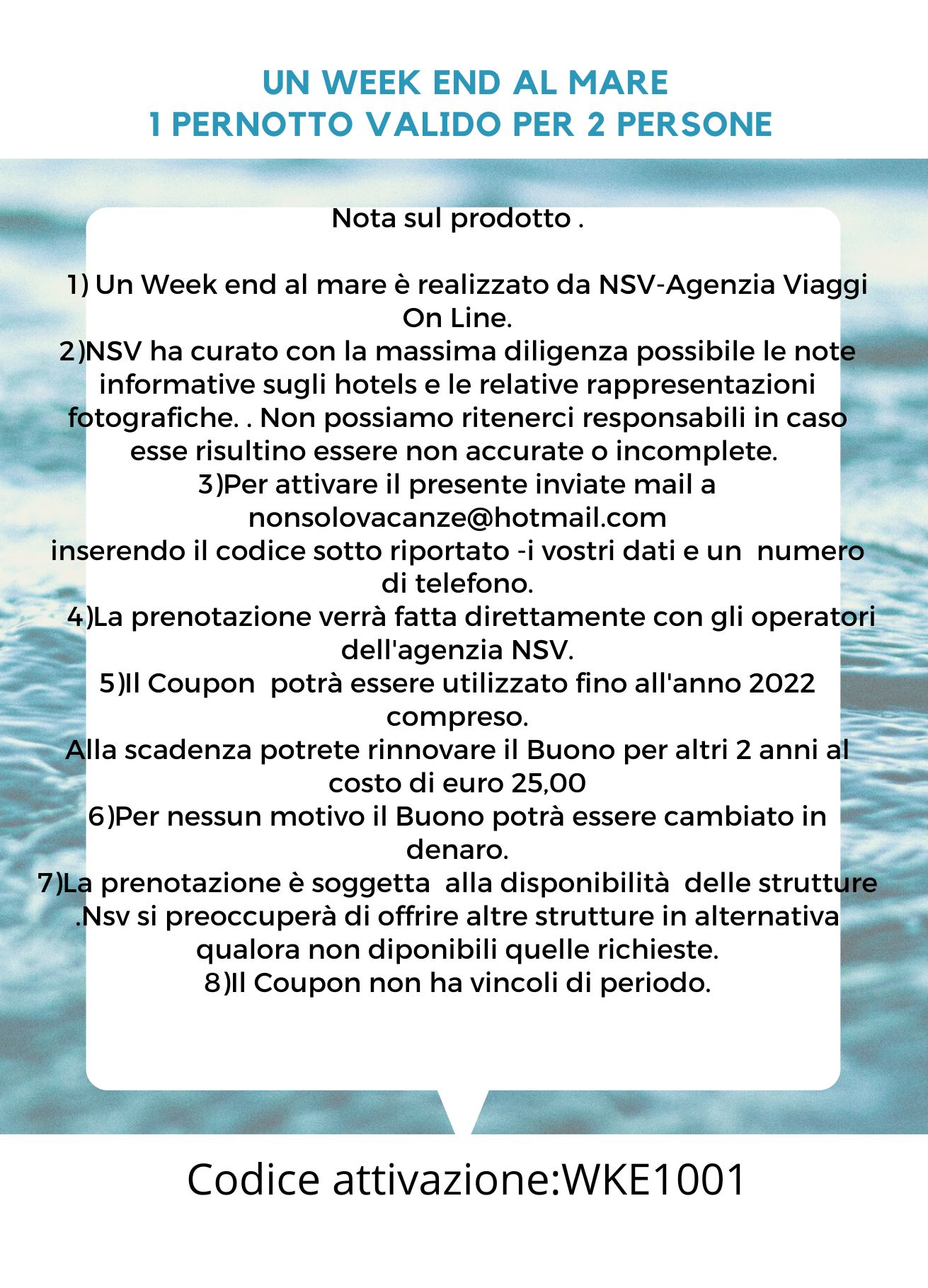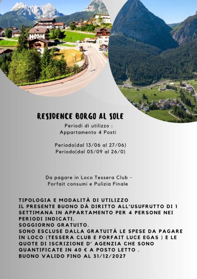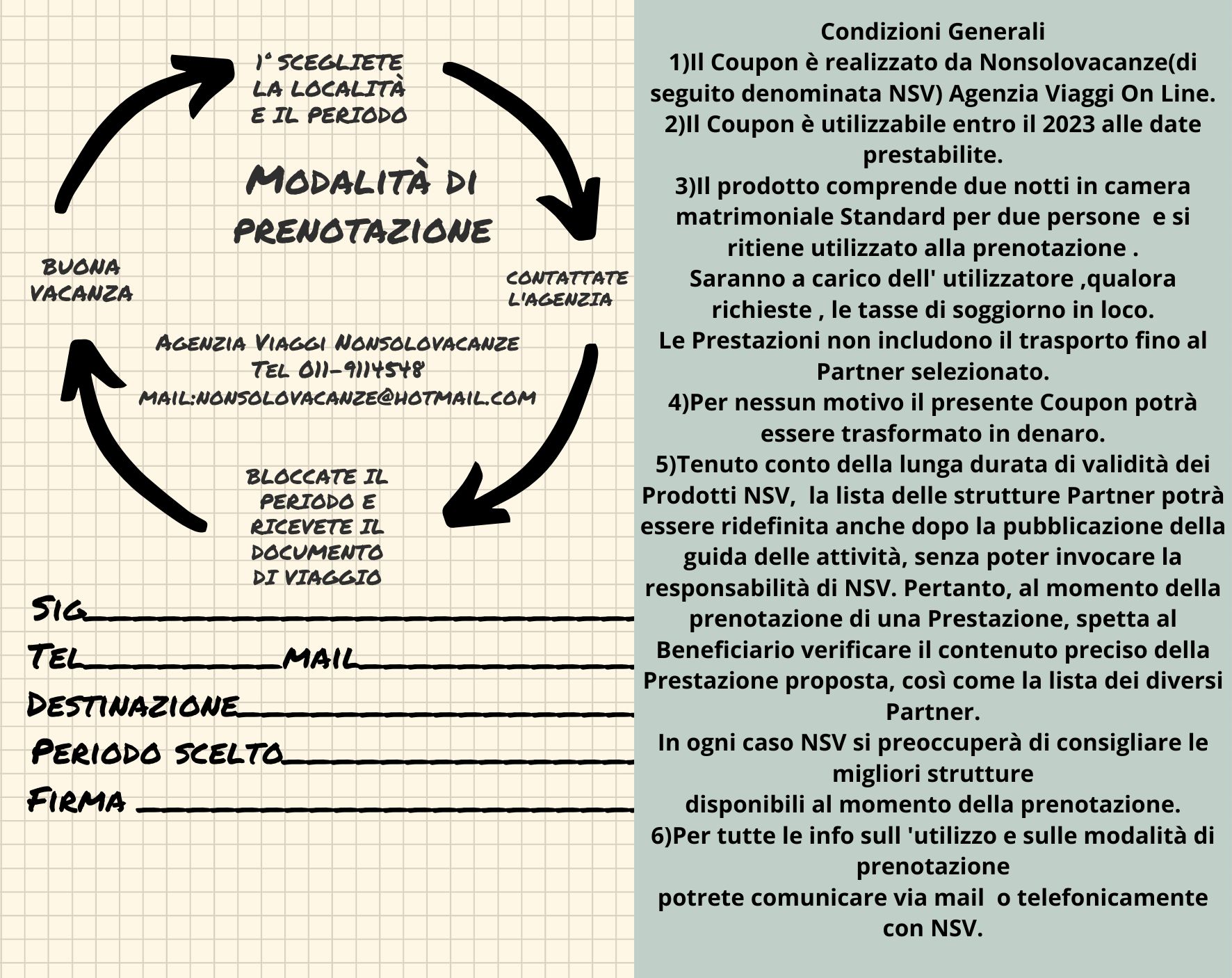 4) Per conoscere l’esatto importo delle quote accessorie obbligatorie relative al residence prescelto scrivete direttamente a NSV . Gli stessi costi saranno confermati nella scheda che NSV invierà al possessore del Buono Vacanza a conferma del periodo concordato.