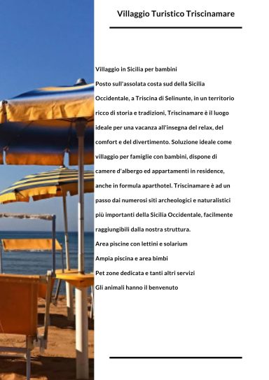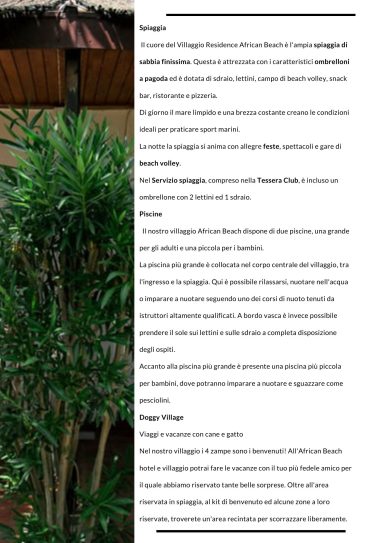 Ottimo per chi vuole coniugare tranquillità con giochi e sport. Soprattutto grande ospitalità per gli amici a quattro zampe. Professionalità garantita da parte di tutto lo staff. Spazio per gli amici a quattro zampe sia in spiaggia che nel villaggio.