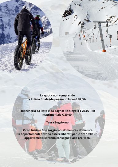 3) E’ obbligatorio il pagamento delle quote accessorie (tessera club, forfait consumi acqua, luce e gas, pulizie finali) in base alla quota del singolo residence. Queste si dovranno saldare in relazione ai posti letto, cioè necessariamente per minimo quattro persone, mediante bonifico bancario o vaglia postale intestato direttamente alla società di gestione come indicato nella scheda di conferma della prenotazione.
