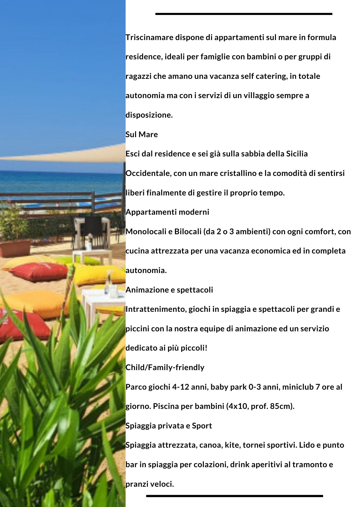 2) E’ prevista una sistemazione in appartamenti o bungalow bilocali o trilocali, con camera da letto, soggiorno con angolo cottura e bagno, in strutture minimo 3 stelle, nei periodi di bassa e media stagione, con possibilità di sconto fino al 50%.