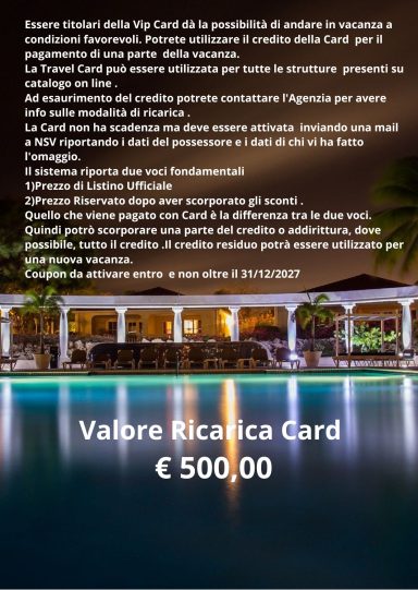 Grazie alla Vip Card avrete un Importo ricaricato con il quale potrete pagare in parte le vostre vacanze.Il credito non ha data di scadenza e si può utilizzare fino al consumo.